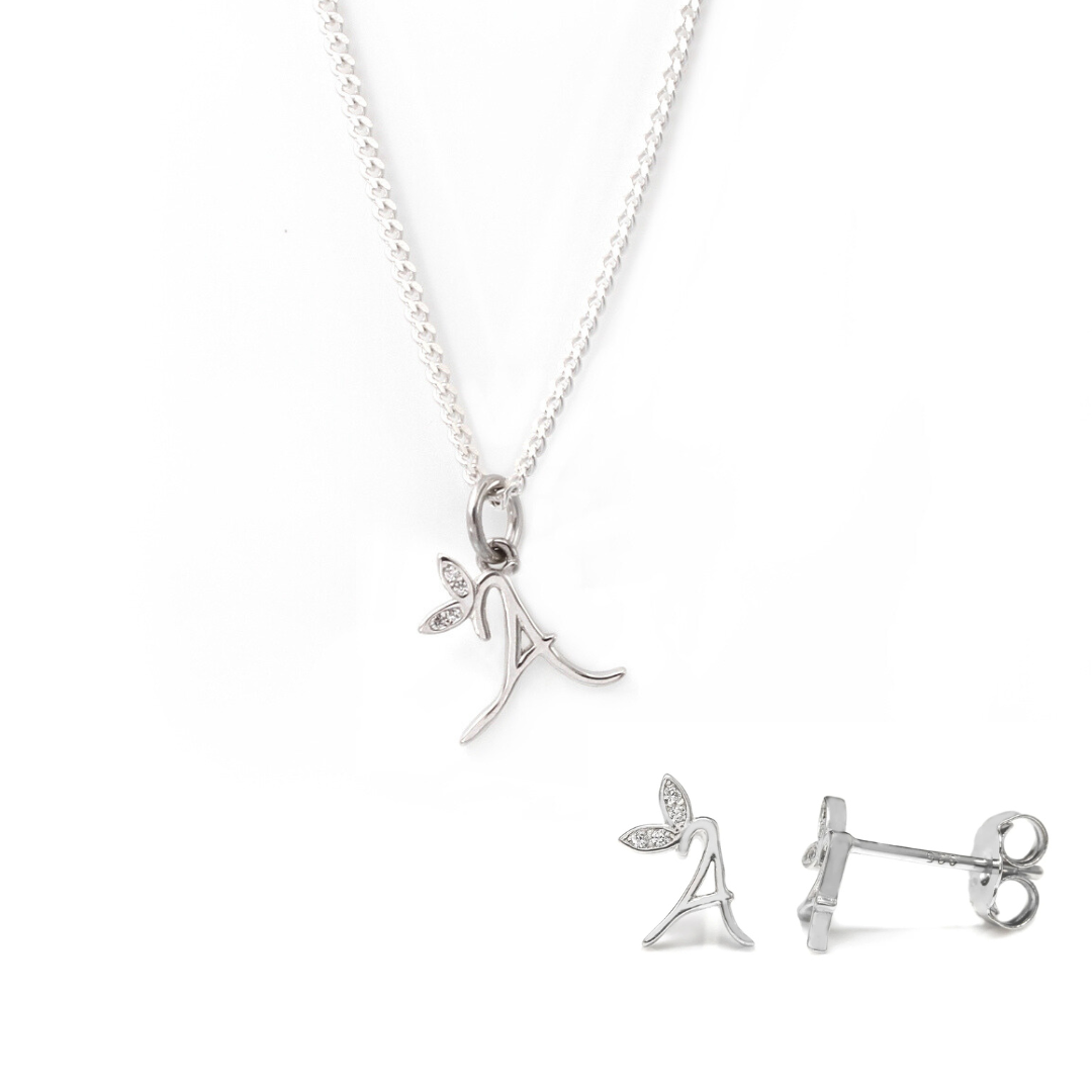 Our dainty winged initial bundle includes our dainty winged charm necklace & winged initial earrings in the initial of your choice, with cubic zirconia stones on the upper wing.