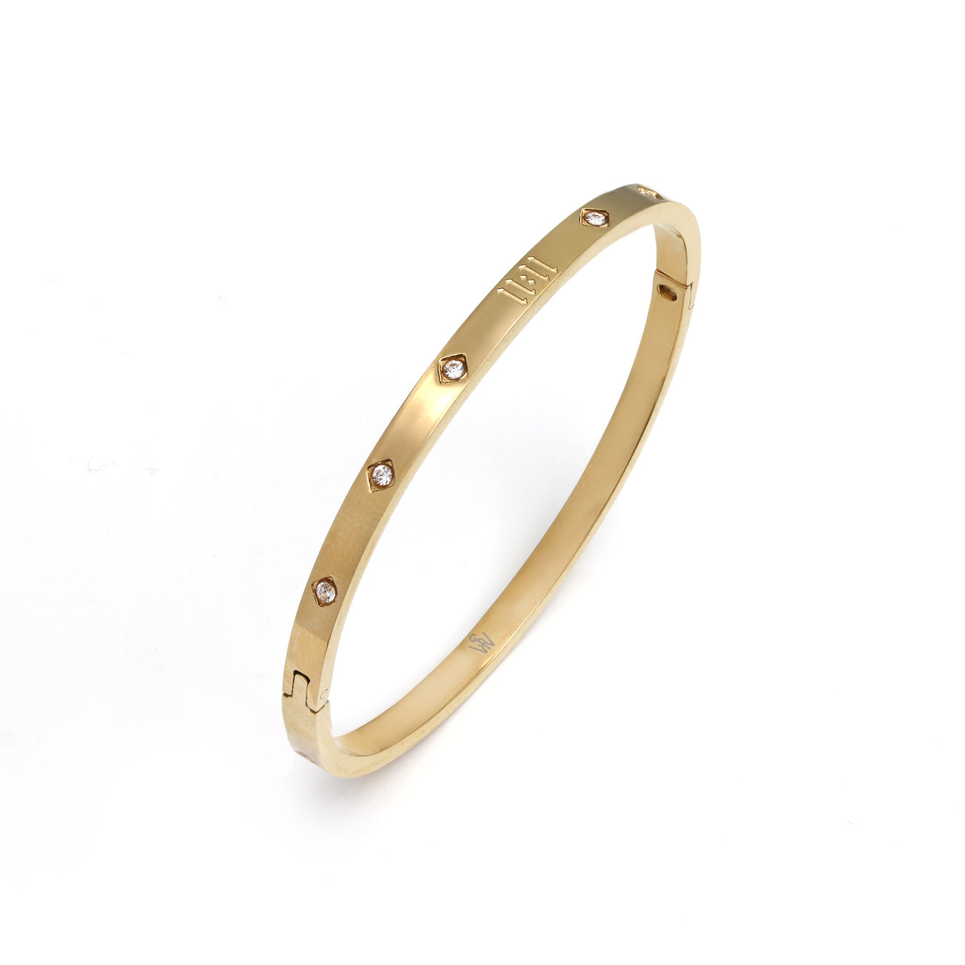 Sleek and sophisticated, the yellow gold bangle features an engraved “11:11” and dazzling CZ accents that catch the light beautifully. Its slender profile makes it perfect worn alone or stacked with other favourites - while durable stainless steel ensures it’s ready for everyday wear.