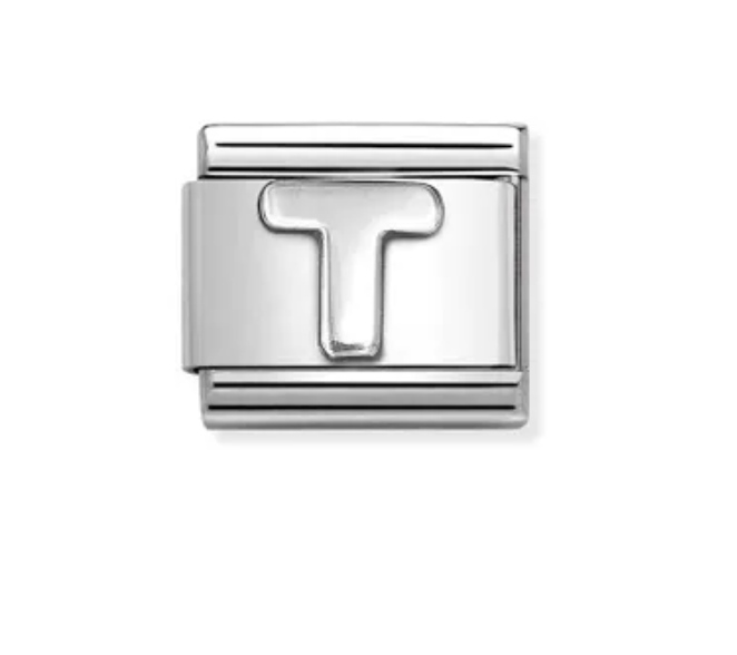 Original Nomination Link for Composable Classic Bracelets in stainless steel and sterling silver with oxidised vintage effect with Alphabet Letter T. Made in Italy. The new Silvershine letters in sterling silver are modern, linear little miracles of craftsmanship that are affordable and meant for everyone, regardless of gender. Tell your story, one letter at a time.