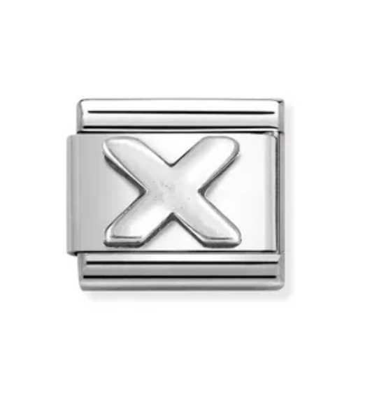 Original Nomination Link for Composable Classic Bracelets in stainless steel and sterling silver with oxidised vintage effect with Alphabet Letter X. Made in Italy. The new Silvershine letters in sterling silver are modern, linear little miracles of craftsmanship that are affordable and meant for everyone, regardless of gender. Tell your story, one letter at a time.