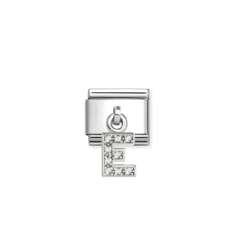 Original Nomination Composable Classic Link for Composable bracelet in stainless steel with silver with White Cubic Zirconia on Letter E Pendant. Keep someone dear to you with you always.