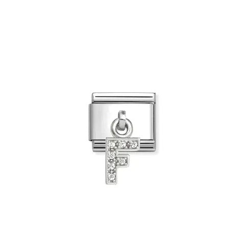 Original Nomination Composable Classic Link for Composable bracelet in stainless steel with silver with White Cubic Zirconia on Letter F Pendant. Keep someone dear to you with you always.