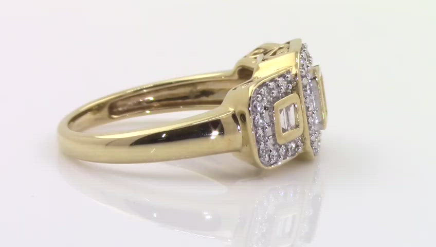 This beautiful ring design is the perfect midpoint between classic and unconventional. Three square precious stones are surrounded by square single halos of .50 carat diamonds.