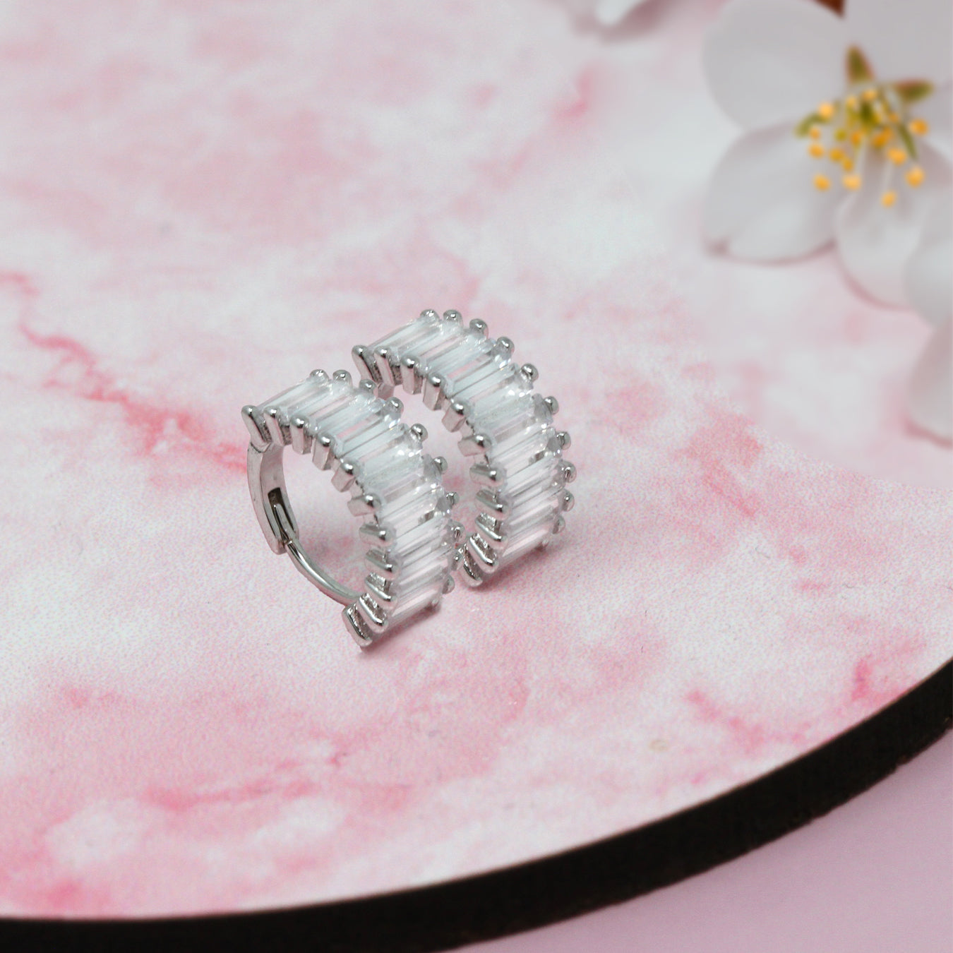 Crafted from durable stainless steel and finished in a sleek silver tone, each earring features a row of shimmering cubic zirconia stones arranged in eye-catching baguette cuts. The result is a timeless look that blends minimalist style with just the right amount of shine.