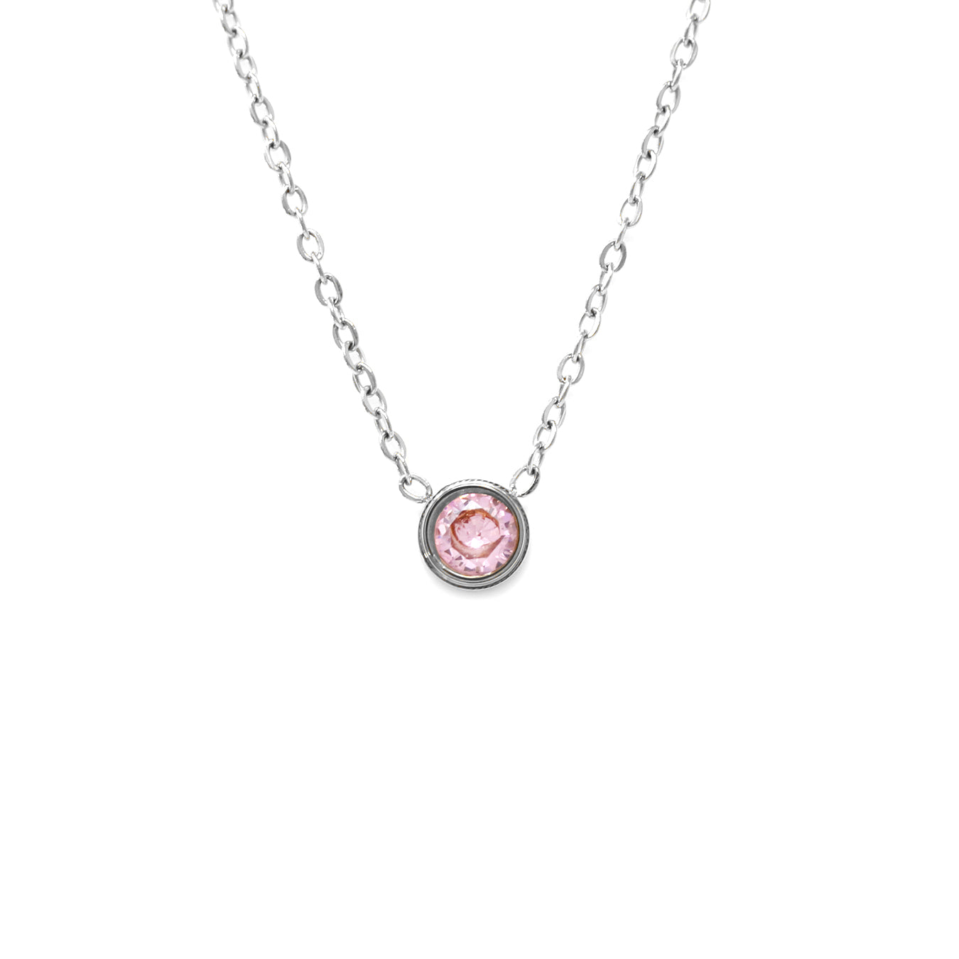 An ideal piece for transforming a simple everyday look into something special, the Dainty Bezel Set Necklace is a stunning silver necklace with a pink CZ stone pendant attached. Crafted from stainless steel, meaning this necklace is waterproof, anti-tarnish, and anti-fade.