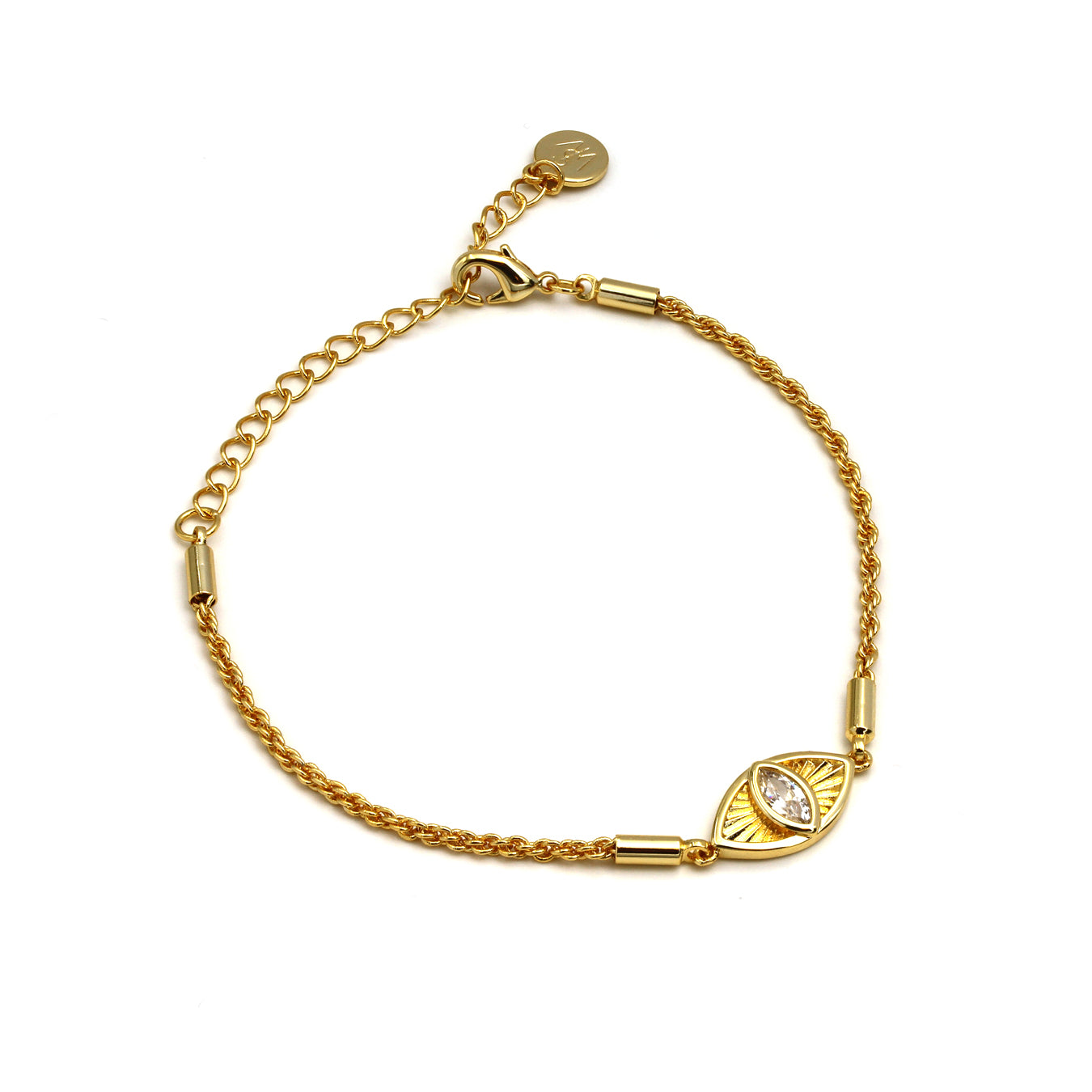 Featuring a clear evil eye shaped pendant on a cable chain bracelet, with a clear round CZ feature stone. The fine cable chain is 1.2mm thick and is coated in 18k yellow gold.