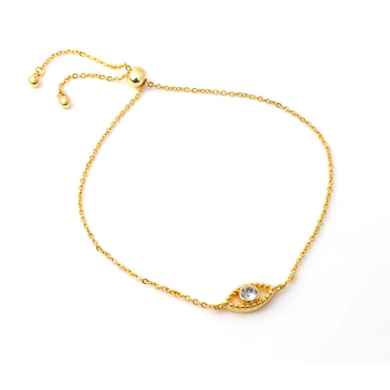 Featuring an evil eye shaped pendant on a cable chain bracelet, with a clear round CZ feature stone. The fine cable chain is 1.2mm thick and is coated in 18k yellow gold.