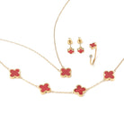 Radiant, romantic, and effortlessly elegant - the Cherry Red Crystal Clover Gift Set in Yellow Gold is designed to dazzle. This four-piece collection includes a necklace, bracelet, ring, and earrings, each beautifully crafted from stainless steel and finished with a luxurious yellow gold plating.