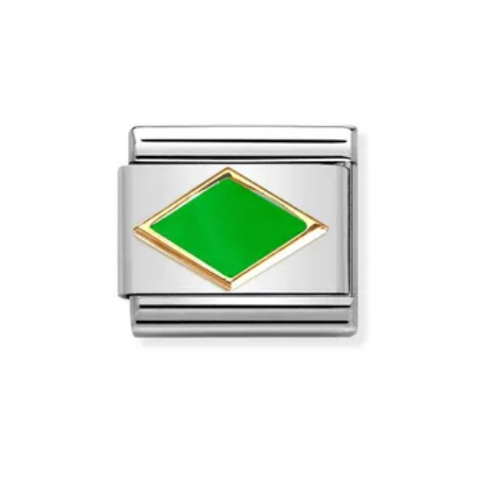 Shop the Classic Green Rhombus Link from Nomination. A silver stainless steel link featuring a green rhombus design with a yellow gold outline.