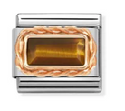 Original Nomination Link for Composable Classic Bracelets in stainless steel and rectangular Tiger Eye stone with 9K rose gold ornate setting. Made in Italy. Add this striking Red Coral Link to your bracelet, with other rose gold Links for an overall Wow look.