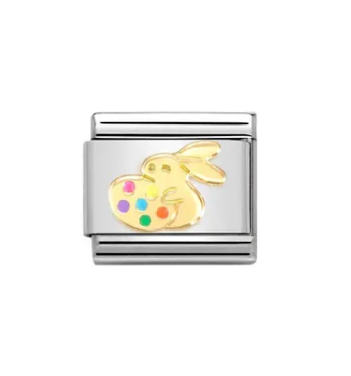 Original Nomination Classic Link in stainless steel and 18K yellow gold with coloured enamel with Bunny with Easter Egg symbol. Made in Italy. Choose this sweet, colourful Link to wish a Happy Easter to loved ones of all ages.
