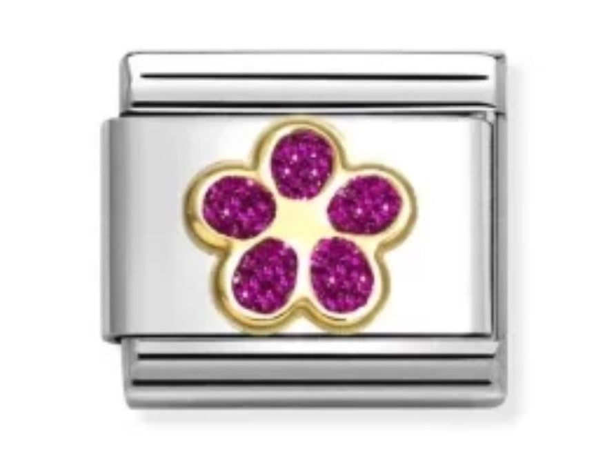 Shop the Classic Gold Fuchsia Flower Link from Nomination. A silver stainless steel link featuring a yellow gold flower design with fuchsia enamel detail.
