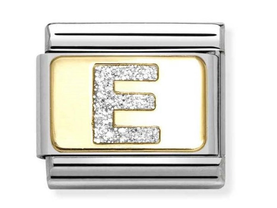Classic gold plated letter "E" link from Nomination with glitter letter detail.