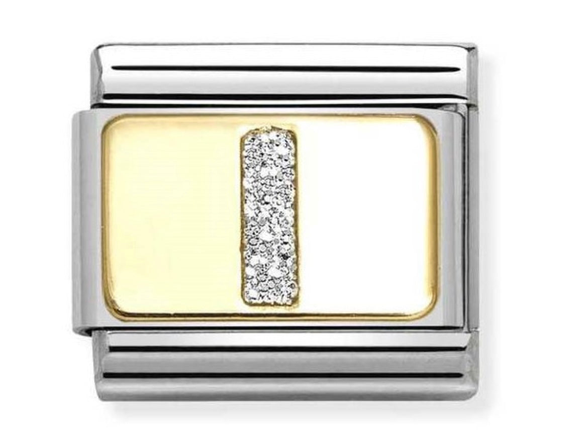 Classic gold plated letter "I" link from Nomination with glitter letter detail.