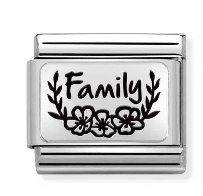 The Classic Silver Family with Flowers Charm from Nomination makes the perfect gift to celebrate an unbreakable bond. Crafted from sterling silver and a stainless steel base, this charm is lovingly engraved with 'Family' and a beautiful floral design.