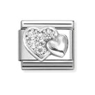 Shop the Classic Silver CZ Raised Double Heart Link from Nomination. A silver stainless steel link featuring a double heart design, with one heart displaying stunning CZ stones.