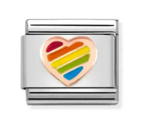 Original Nomination Classic Link in stainless steel and 9K rose gold with Heart Rainbow symbol with coloured enamel. Made in Italy. Love knows no boundaries, no colours - celebrate Love and unity with this Link for yourself or for someone else.