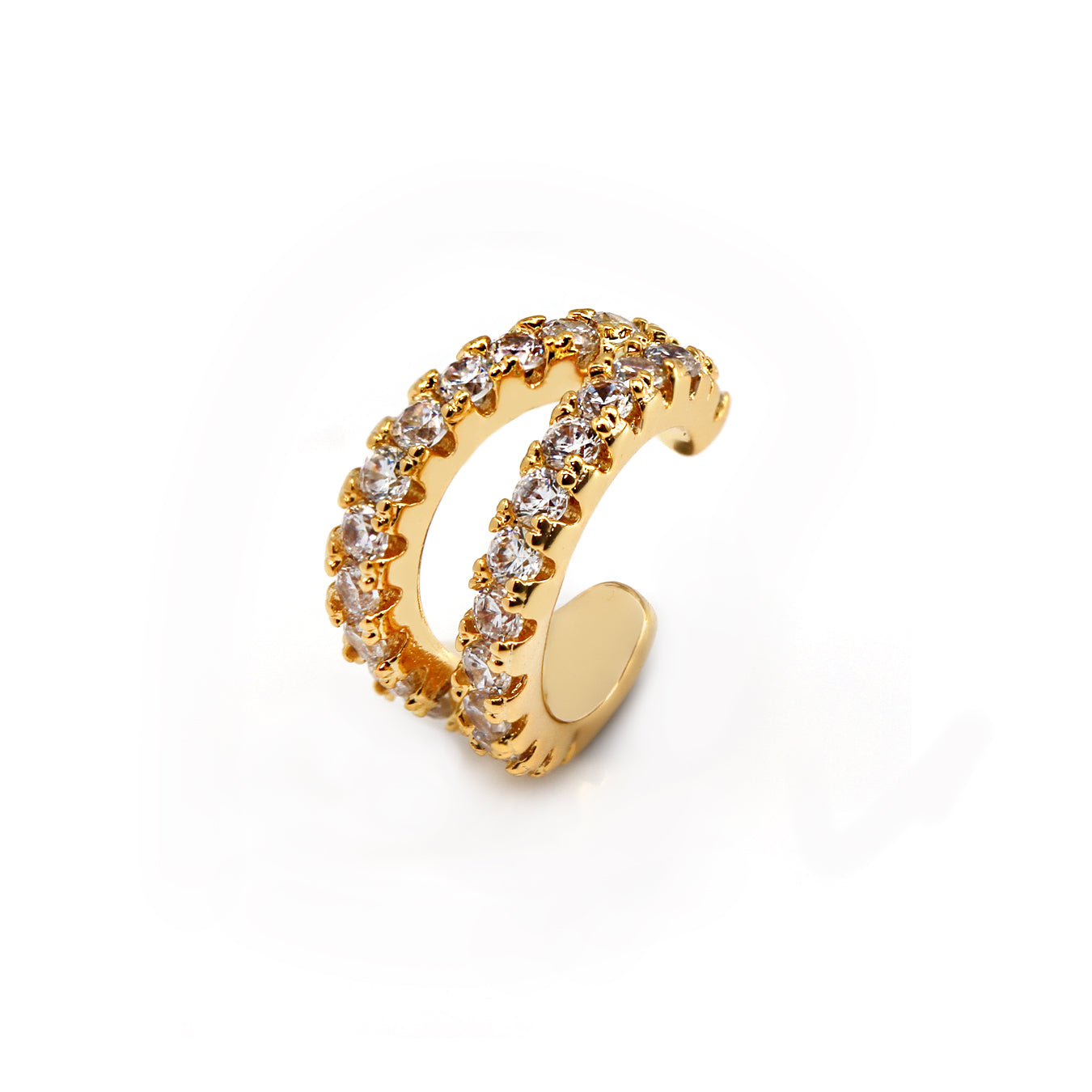 Beautiful ear cuff design with stunning CZ stones adorning the front of the band. Plated in 18k yellow gold with a high polish finish, this ear cuff looks perfect either stacked or worn alone.