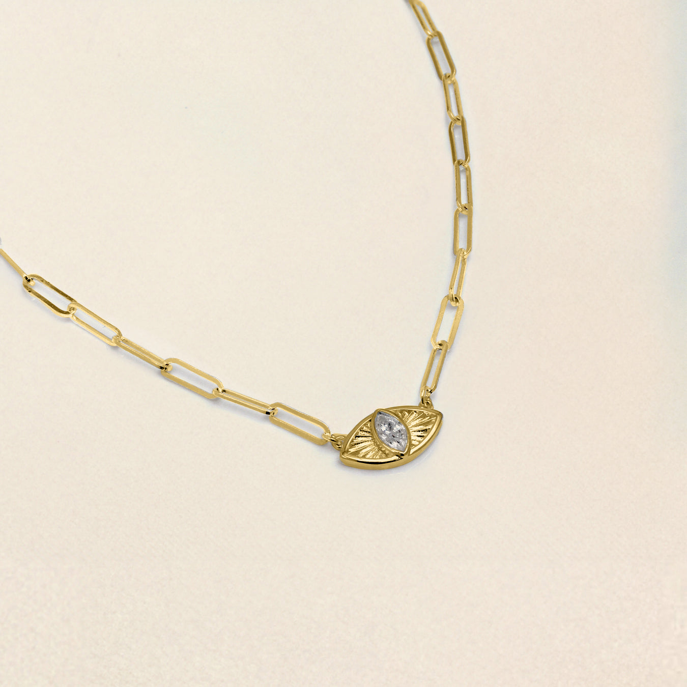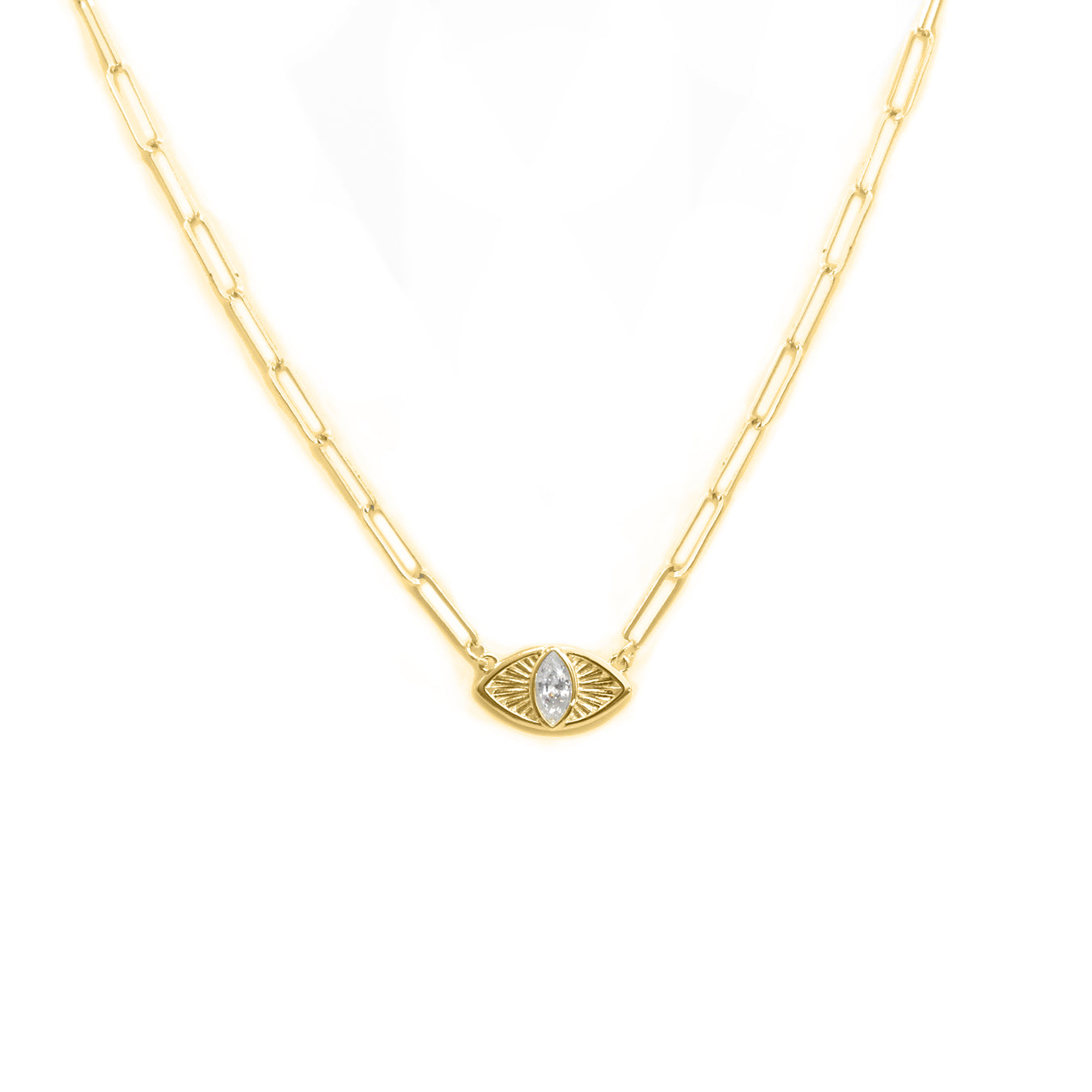Features a pendant crated in the shape of an eye with a stunning clear CZ marquise stone featuring prominently in the middle to give the evil eye design. The pendant comes on a fine paperclip chain, plated in 18k yellow gold.