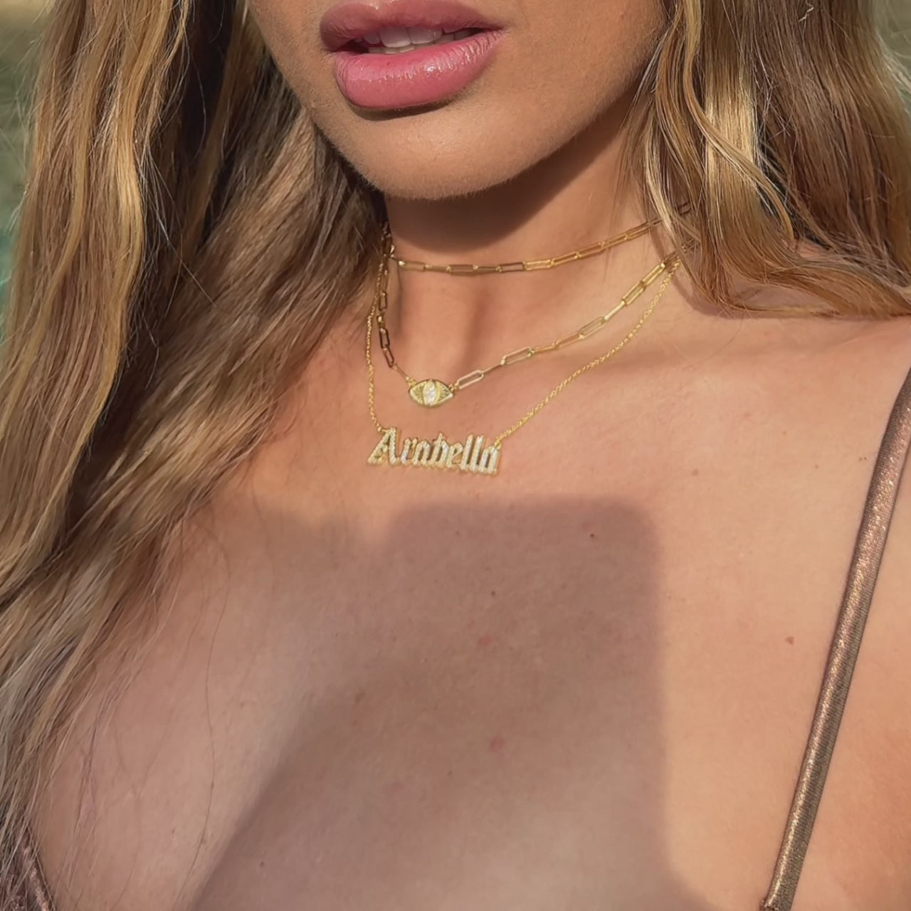 Introducing the Clear Stone Evil Eye Necklace in Yellow Gold, taken from the stunning Arabella Chi Edit.