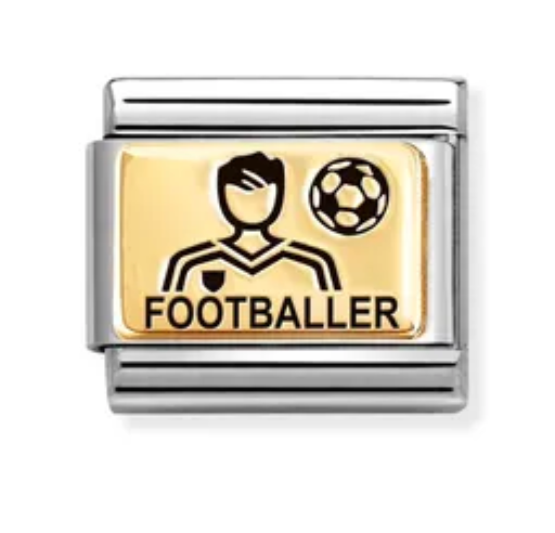 Shop the Classic Male Footballer Link from Nomination. A silver stainless steel link featuring a yellow gold plate with a black enamel male footballer design.