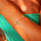 Plated in radiant yellow gold, the 8-inch chain is adorned with four clover-shaped pendants, each featuring a jade crystal at its centre. Revered for its symbolism of luck, harmony, and protection, jade adds a meaningful touch to this elegant piece.