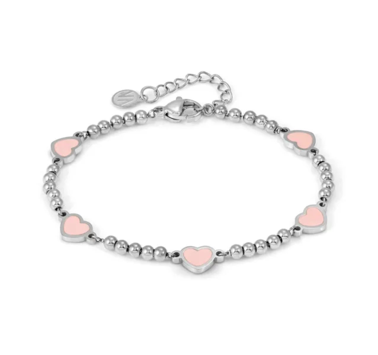 Stainless steel bracelet. Elegante Mother of Pearl Hearts or bright enamel Hearts in Pastel Pink, Pastel Green or Black along the length of the bracelet. Every detail, every small sliding sphere will illuminate your look. Choose this bracelet as a way to celebrate special moments like a First Holy Communion, a Confirmation or Graduation. The bracelet from the Emosfere Collection is a gift they will delight in for a long time to come.