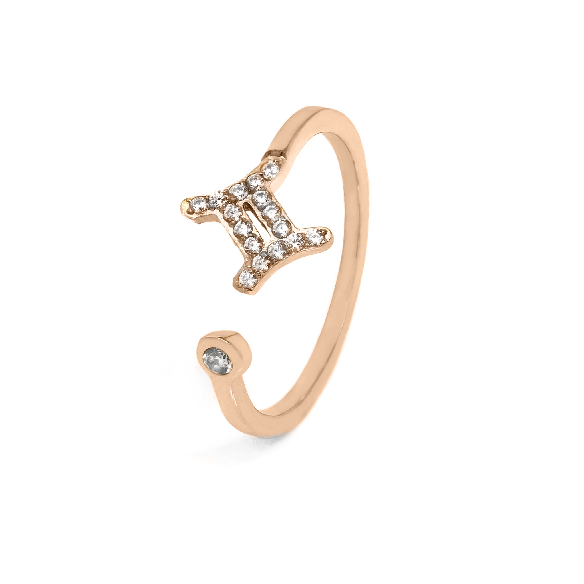 This stunning Gemini Ring in Rose Gold is crafted from stainless steel and features dazzling CZ feature stones on an adjustable ring.