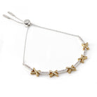 Crafted from stainless steel, the bracelet features an adjustable tennis-style design adorned with shimmering cubic zirconia stones for a bright, eye-catching finish. Interspersed throughout is a delicate yellow-gold kiss design that brings contrast, warmth, and a unique mixed-metal appeal.