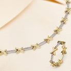 Our tennis necklace is made up of stainless steel and CZ stones decorated beautifully with a contrasting yellow gold kiss design.