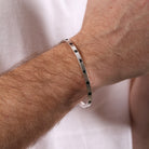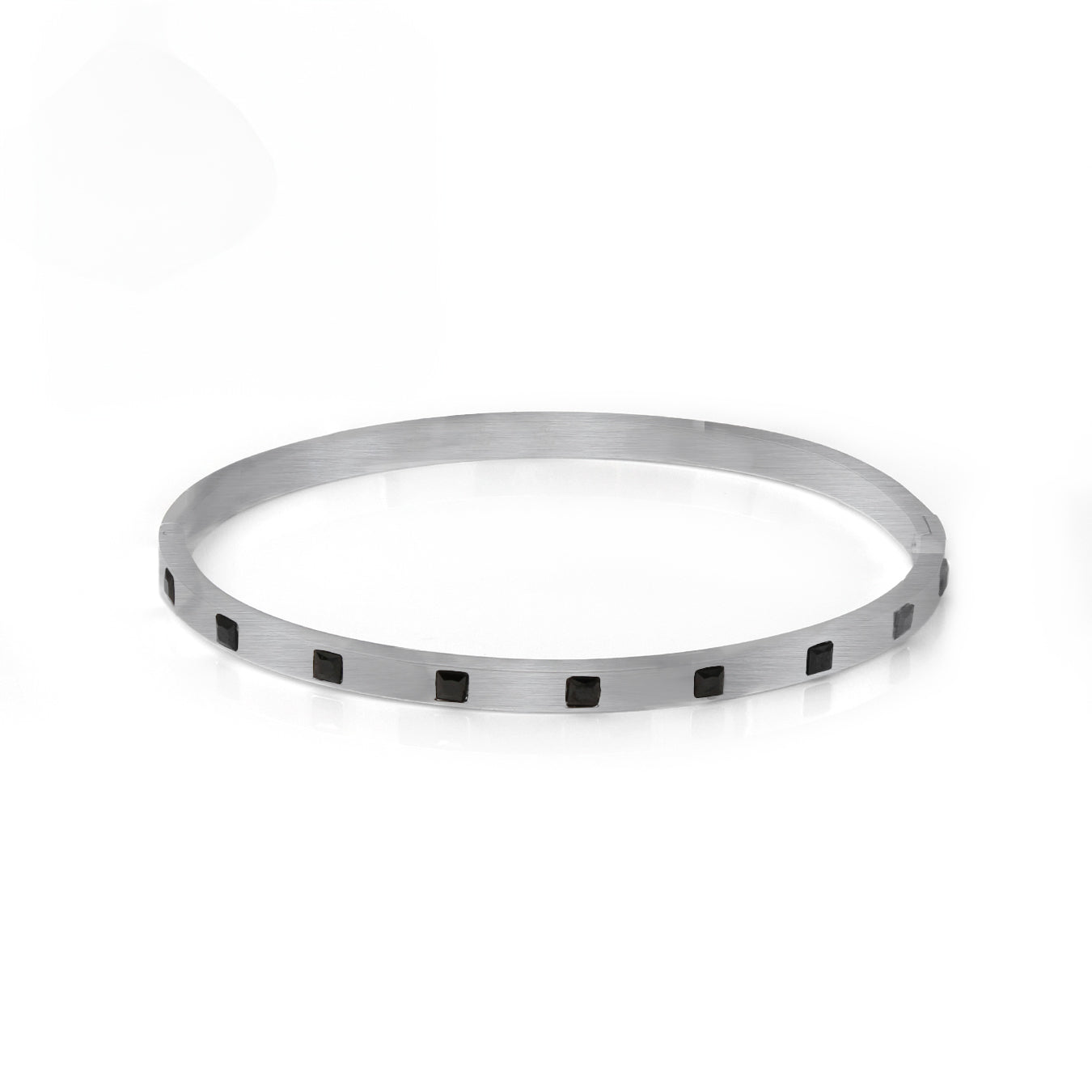 The minimalist stainless steel design is elevated by a series of square black CZ stones set around the bangle, offering a bold yet refined contrast. This versatile piece is perfect for enhancing both casual and formal attire, making it an essential addition to any man's accessory collection.