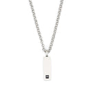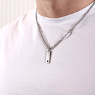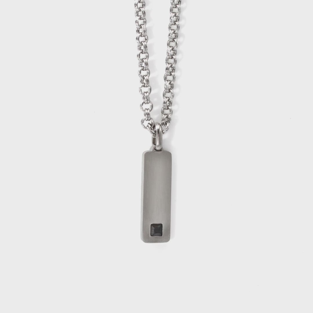 The sleek tag-shaped pendant is the centrepiece of this design, embodying a modern and masculine aesthetic. A striking black square CZ stone is embedded at the bottom of the tag, adding a touch of understated luxury and sophistication. Perfect for everyday wear or special occasions, this pendant on a double link cable chain effortlessly complements any outfit.