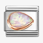 The Nomination Classic 9ct Rose Gold Pink Opal Right Link features a pink faceted opal stone set in a 9ct rose gold frame. The opal is elegantly oriented to the right, adding a timeless and luminous touch to the design.