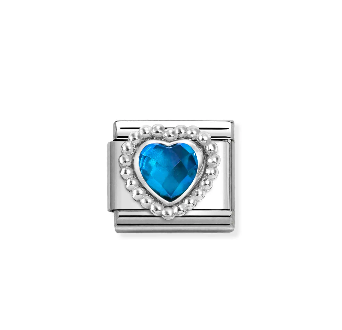 The Nomination Classic Beaded Blue CZ Heart Link features a stainless steel plate featuring a stunning faceted CZ Blue heart surrounded by intricate silver beading.