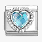 The Nomination Classic Beaded Light Blue CZ Heart Link features a stainless steel plate featuring a stunning faceted CZ light blue heart surrounded by intricate silver beading.