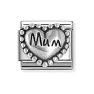 The Nomination Classic Beaded Mum Heart Link features a stainless steel plate featuring a beaded heart design with "Mum" engraved in the centre.