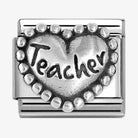 The Nomination Classic Beaded Teacher Heart Link features a stainless steel plate featuring a beaded heart design with "Teacher" engraved in the centre.