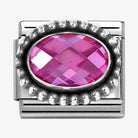 The Nomination Classic CZ Beaded Fuchsia Pink Oval Link features a stainless steel plate featuring a stunning CZ fuchsia pink oval surrounded by intricate silver beading.