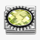 The Nomination Classic CZ Beaded Green Oval Link features a stainless steel plate featuring a stunning CZ green oval surrounded by intricate silver beading.