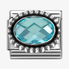 The Nomination Classic CZ Beaded Light Blue Oval Link features a stainless steel plate featuring a stunning CZ light blue oval surrounded by intricate silver beading.