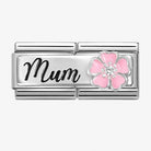 The Nomination Classic Mum CZ Flower Double Link features a stainless steel plate featuring the word "Mum" engraved in black enamel alongside a CZ encrusted pink flower design.