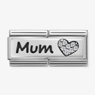 The Nomination Classic Mum CZ Heart Double Link features a stainless steel plate featuring the word "Mum" engraved in black enamel alongside a CZ encrusted heart design.