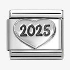 The Nomination Classic Silver & Black 2025 Heart Link features a stainless steel plate featuring a heart design with the year "2025" engraved in black enamel.