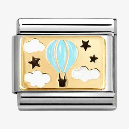 The Nomination Classic Yellow Gold Blue Hot Air Balloon Link features an 18ct yellow gold plate with a blue enamel hot air balloon design, accented with black enamel stars and white enamel clouds.