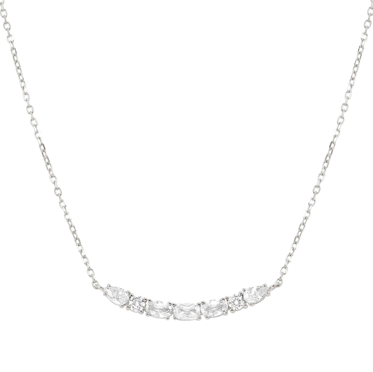 This simple but striking silver necklace is available with yellow gold galvanic plating or white rhodium treated finish. It is decorated with white Cubic Zirconia and it is both lightweight and sophisticated. This jewel is versatile and is perfect for someone who is looking for a refined accessory that they can wear on different occasions.