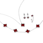 Each piece showcases a delicate four-leaf clover pendant adorned with a deep plum crystal, symbolizing luck, love, and positivity. The rich plum hue pairs effortlessly with the sleek silver finish, creating a timeless combination that transitions perfectly from day to night.