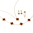 Each piece features a delicate four-leaf clover pendant accented with a rich plum crystal, symbolizing luck, elegance, and timeless beauty. The combination of the warm gold finish and deep plum hue creates a stunning, eye-catching contrast that works beautifully for everyday wear or special occasions.