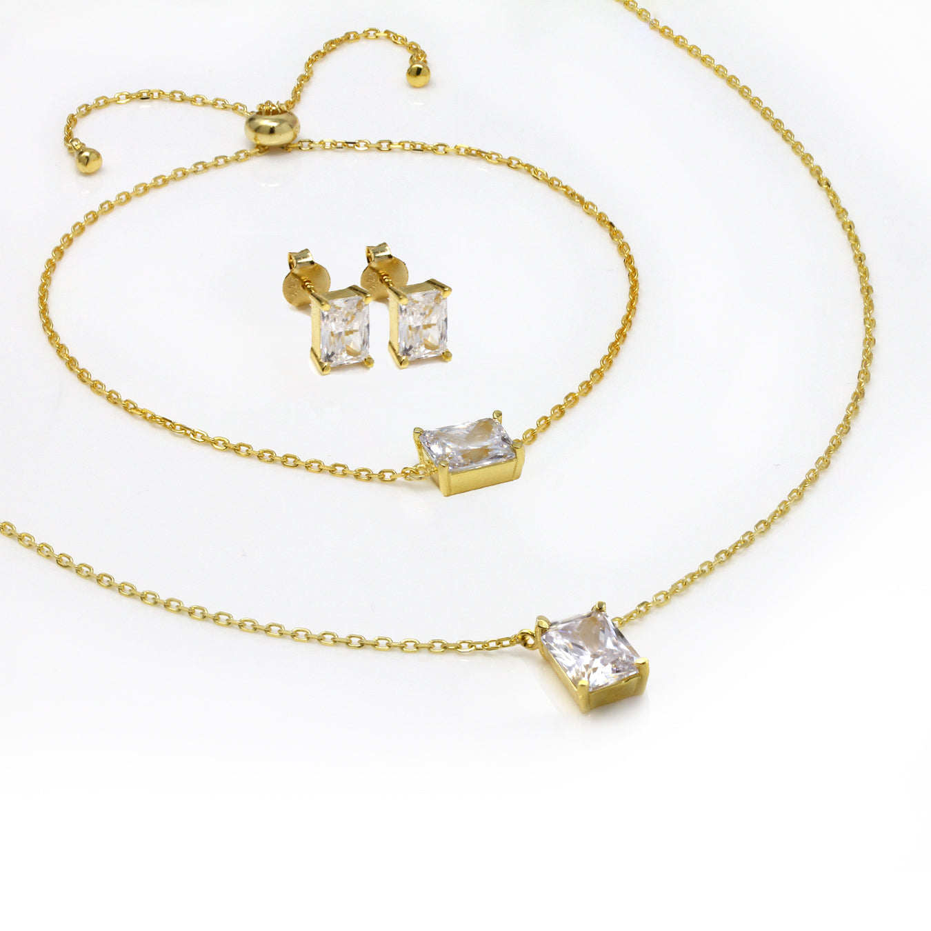 Our sparkling cubic zirconia stone sterling silver gold plated set includes an adjustable necklace, adjustable bracelet and earrings. Each piece is meticulously crafted to showcase the brilliance of the radiant shaped cubic zirconia stone, set in high-quality sterling silver, offering a timeless and sparkling addition to your jewellery collection.