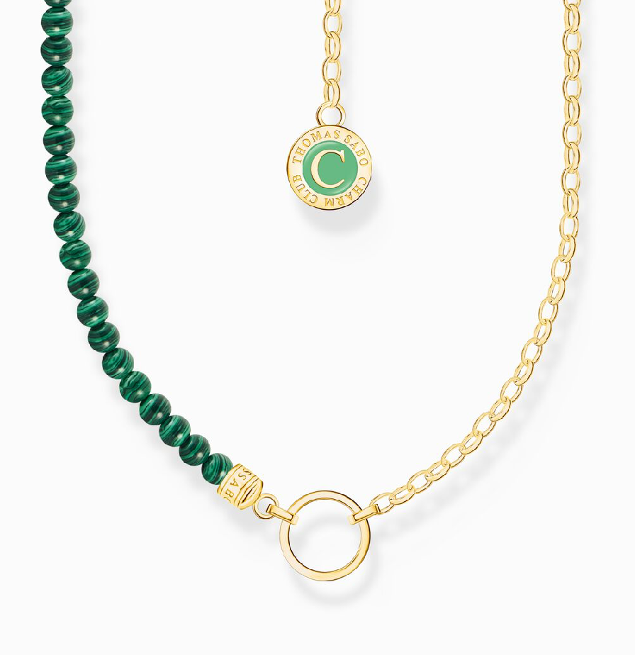 Crafted from Sterling Silver and plated in 18ct yellow gold, with green imitation malachite beads adorning half the chain. The link chain’s end is adorned with a round THOMAS SABO Charm Club Coin that is hand-painted with sparkling green cold enamel.