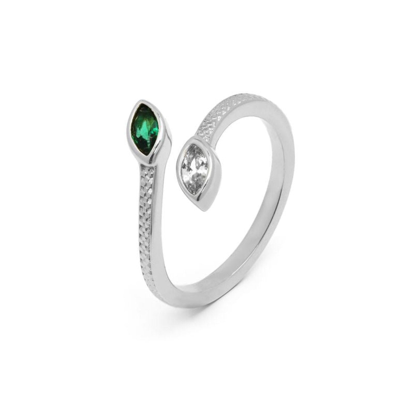 The Snake Ring features two marquise CZ stones at either end, one clear and one emerald. The band features a beaded texture and is plated in 18k silver with a high polish finish.